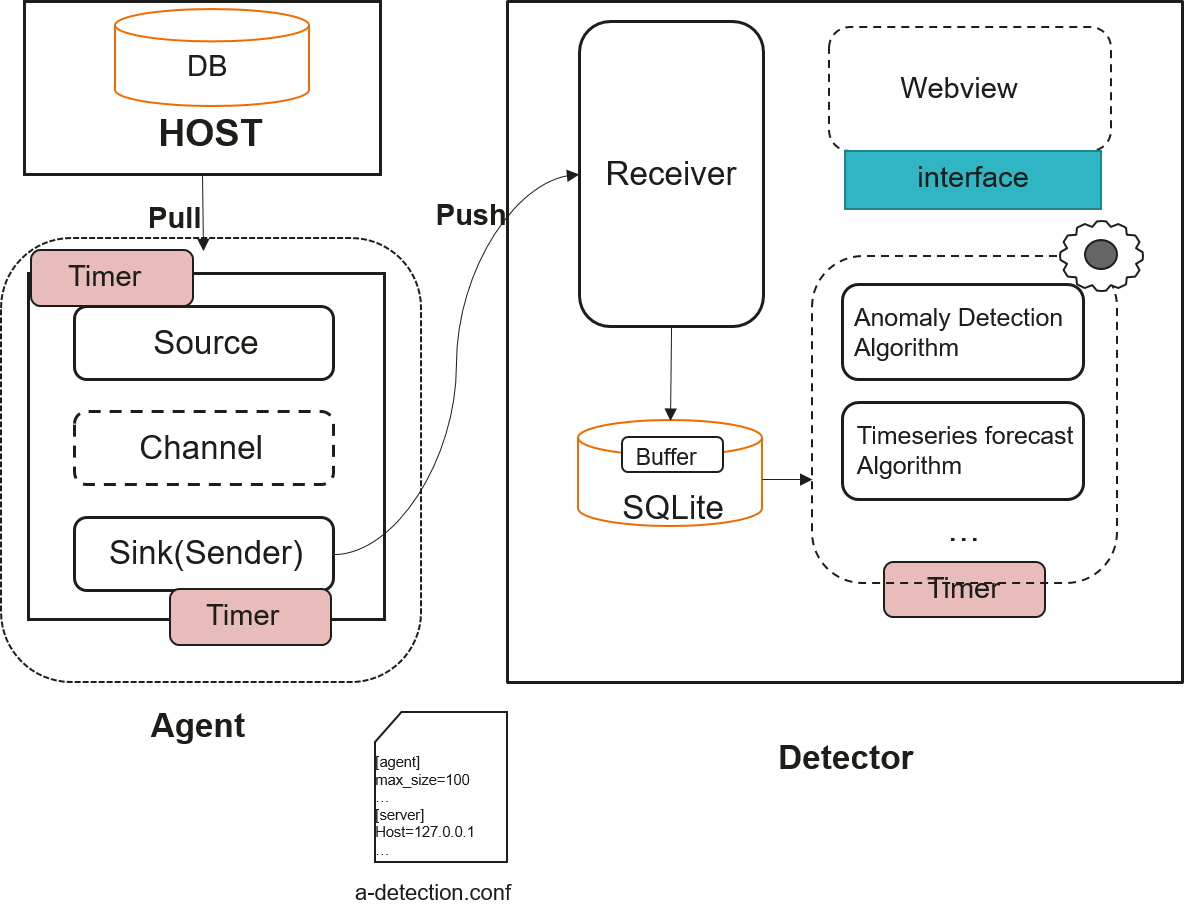 - agent: data agent module, which consists of the source, channel, and sink. It collects metrics in the database and sends the metrics to the remote detector in HTTP or HTTPS mode.
