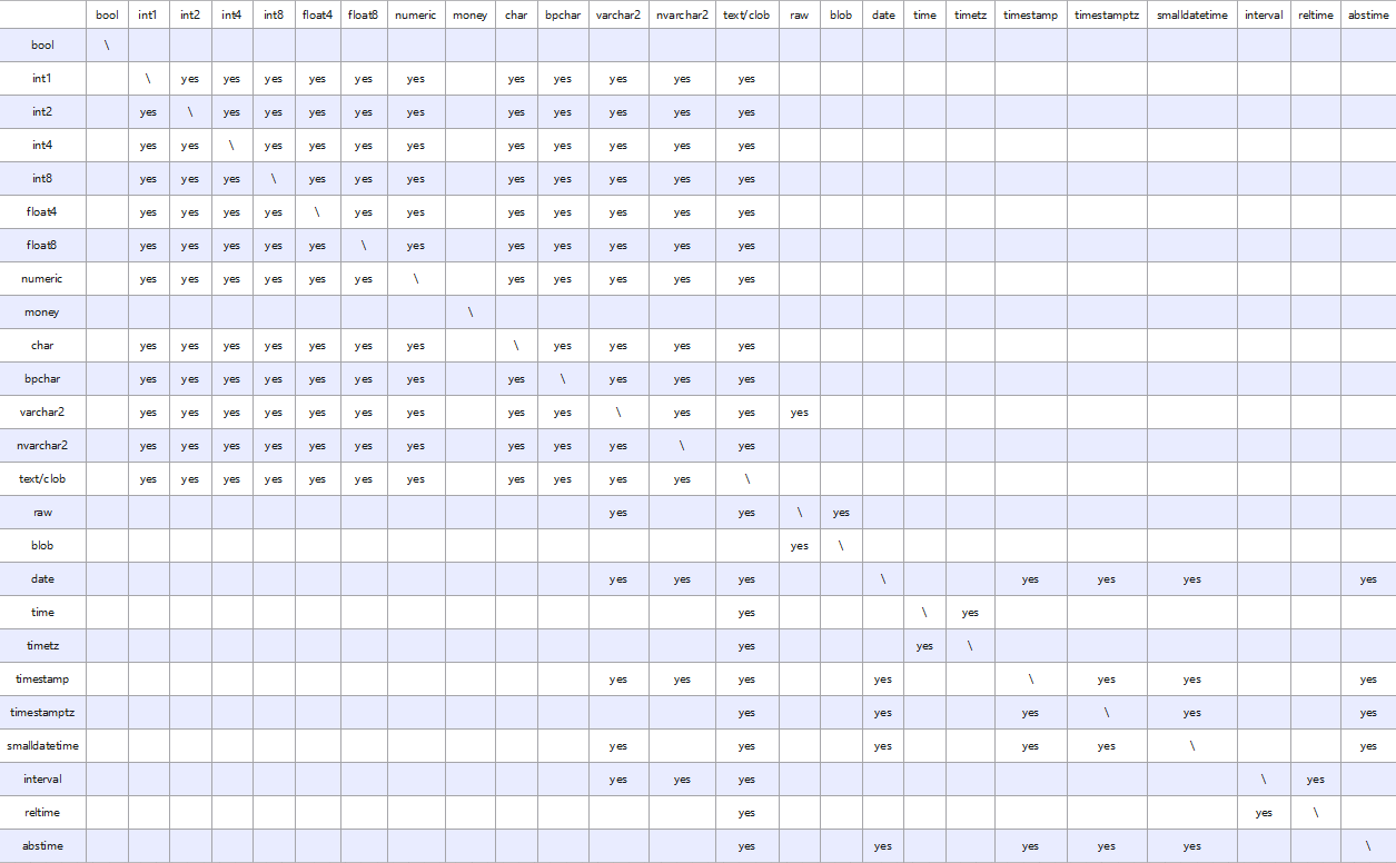 The following figure shows the supported implicit type conversions when the set sql_beta_feature = 'a_style_coerce'; parameter is enabled in ORA compatibility mode.\ indicates that conversion is not required, yes indicates that conversion is supported, and blank indicates that conversion is not supported.