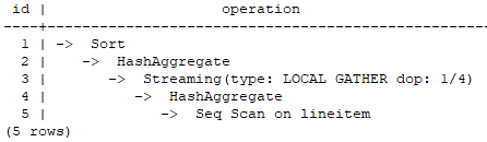 In this plan, the Scan and HashAgg operators are processed in parallel, and the Local Gather operator is added for data exchange. Operator 3 is a Local Gather operator. “dop: 1/4” indicates that the degree of parallelism of the sender thread is 4 and the degree of parallelism of the receiver thread is 1. That is, the lower-layer HashAggregate operator 4 is executed based on the degree of parallelism 4, the upper-layer operators 1 and 2 are executed in serial mode, and operator 3 aggregates data of parallel threads within the instance.