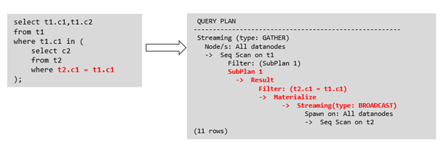 Except the sublinks described above, all the other sublinks cannot be pulled up. In this case, a join subquery is planned as the combination of subplans and broadcast. As a result, if tables in the subquery have a large amount of data, query performance may be poor.