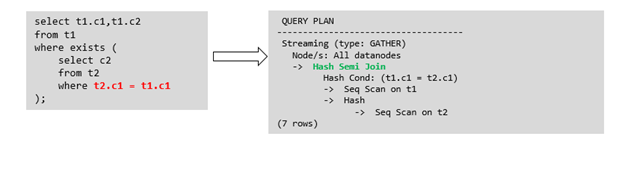 select t1.c1,t1.c2 from t1 where t1.c1 in ( select c2 from t2 where t2.c2 IN (2,3,4) ); QUERY PLAN ---------------------------------------------------------------- Hash Join Hash Cond: (t1.c1 = t2.c2) -> Seq Scan on t1 Filter: (c1 = ANY ('{2,3,4}'::integer[])) -> Hash -> HashAggregate Group By Key: t2.c2 -> Seq Scan on t2 Filter: (c2 = ANY ('{2,3,4}'::integer[])) (9 rows)Correlated subqueries