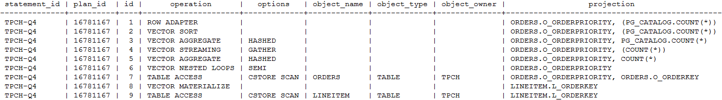 For details about PLAN_TABLE, see PLAN_TABLE.explain plan set statement_id='TPCH-Q4' for select o_orderpriority, count(*) as order_count from orders where o_orderdate >= '1993-07-01'::date and o_orderdate < '1993-07-01'::date + interval '3 month' and exists ( select * from lineitem where l_orderkey = o_orderkey and l_commitdate < l_receiptdate ) group by o_orderpriority order by o_orderpriority;Query PLAN_TABLE.
