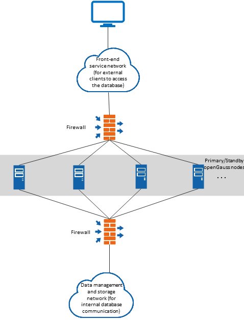 To ensure the security of application data, you are advised to divide the openGauss typical network into two independent networks: front-end service network and data management and storage network.