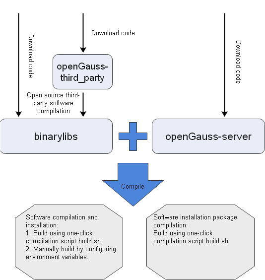 - binarylibs: package for storing the built open-source third-party software. You can obtain the package by referring to Compiling Open-source Software . Since compiling and building open-source software take a long time, we have compiled and built binarylibs using openGauss-third_party and compress and upload binarylibs to the Internet.