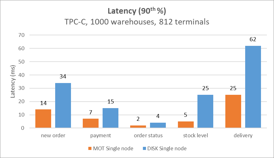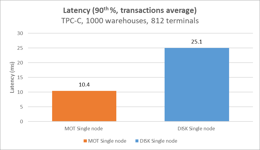 MOT's average transaction speed is 2.5x, with MOT latency of 10.5 ms, compared to 23-25ms for disk tables.