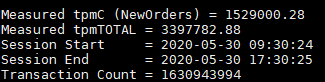 numactl –C 0-19,32-51,64-83,96-115 ./runBenchmark.sh props.opengauss.1000w运行后的结果如下图,tpmC部分即为测试结果。