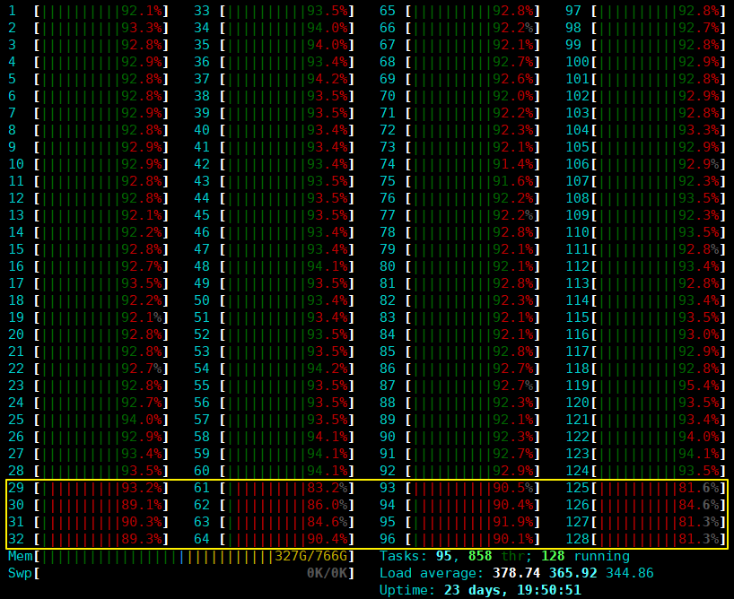 下图是最佳性能测试情况下所有CPU的使用情况,其中黄线框中的是处理网络中断的CPU。