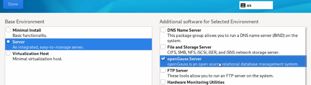 yum install opengauss -y在安装操作系统过程中,software选择openGauss,安装操作系统时候默认安装上openGauss数据库。