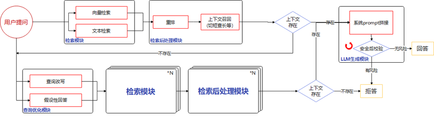 - 当检索的上下文不存在时,对用户提问进行查询优化,分别通过查询改写与假设性回答方法生成多个子查询,随后经过检索与检索后处理模块,获取相关上下文,如果相关上下文不存在,则进行拒答;如果相关上下文存在则进行prompt拼接,由LLM进行安全校验,有风险则进行拒答,无风险则给出生成的回答结果。