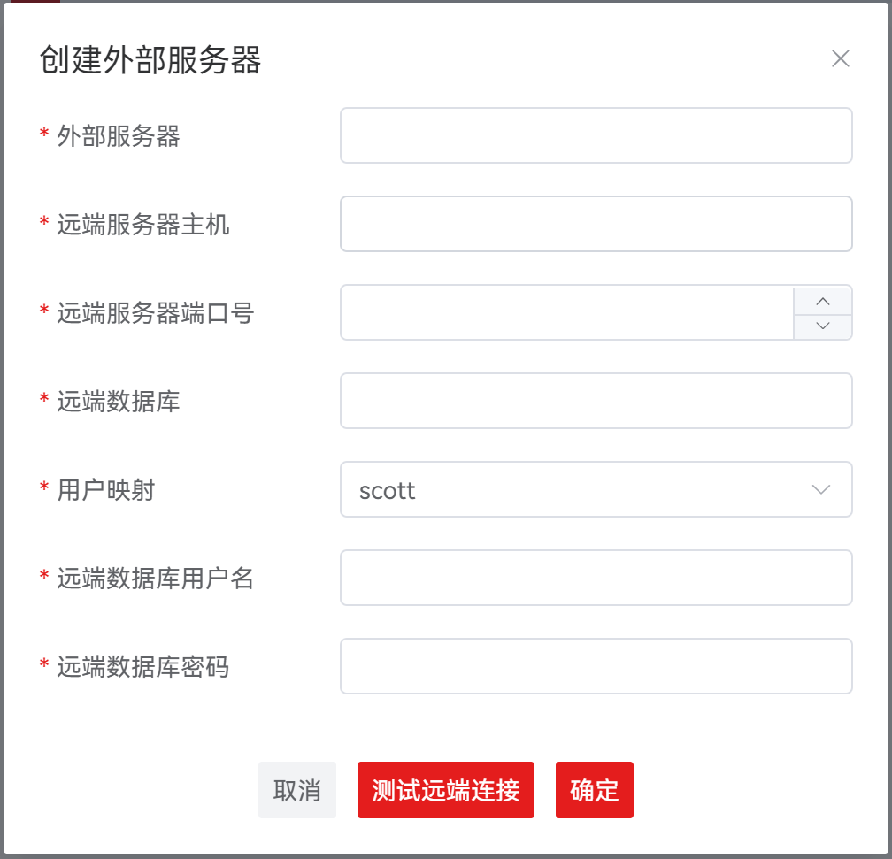 | 外部服务器 | 是 | 用于定义所连接远程服务器名称,默认未选择。选项为当前用户已创建的外部服务器列表。外部服务器支持新建和删除,创建和删除具体说明详见下方 定义外部服务器 。 |
