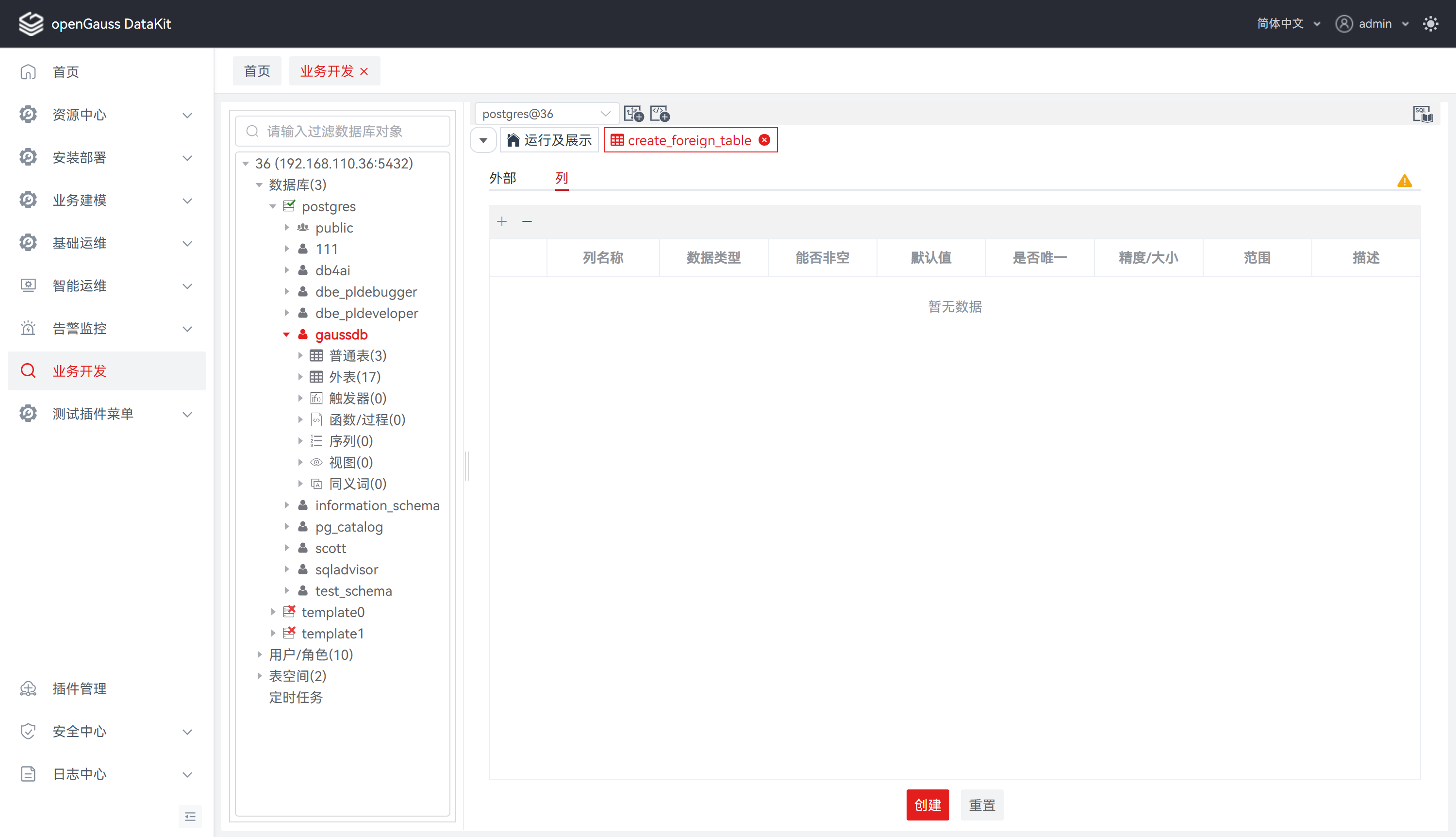步骤 1: 在 “数据库导航菜单” 窗格中,右键单击数据库中的 “外表” ,选择 “创建外表” ,跳转至 “创建外表” 页面。