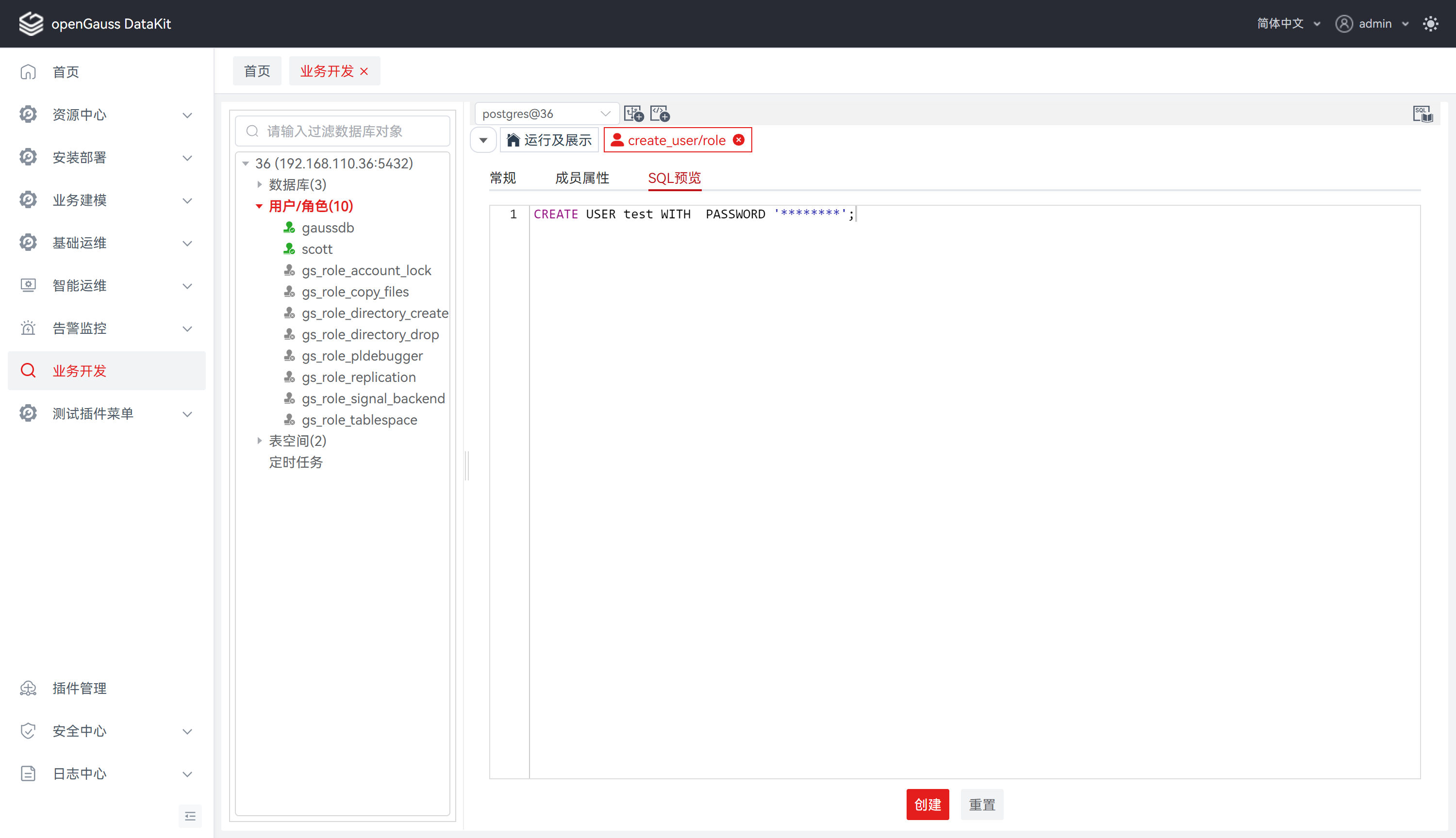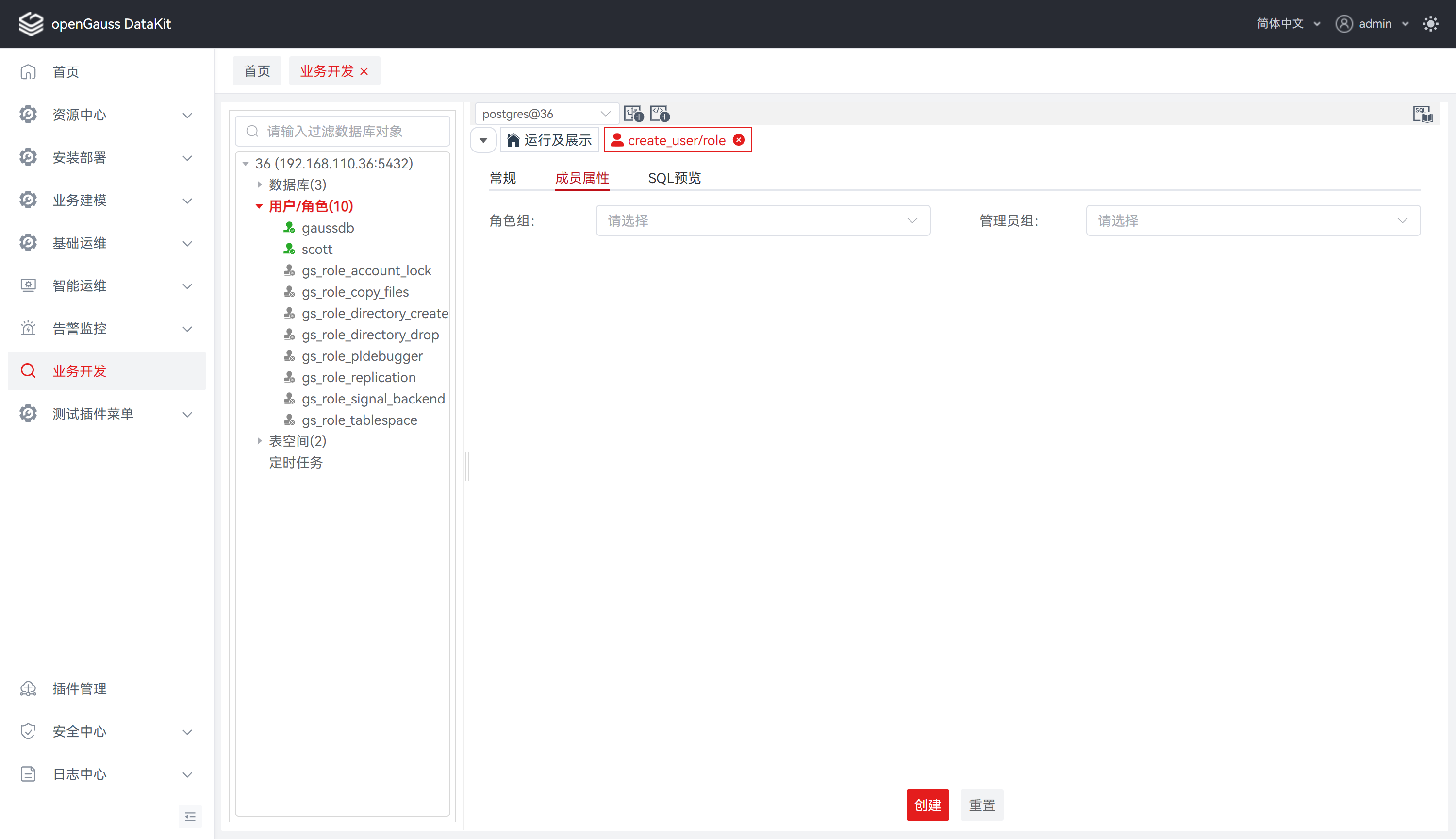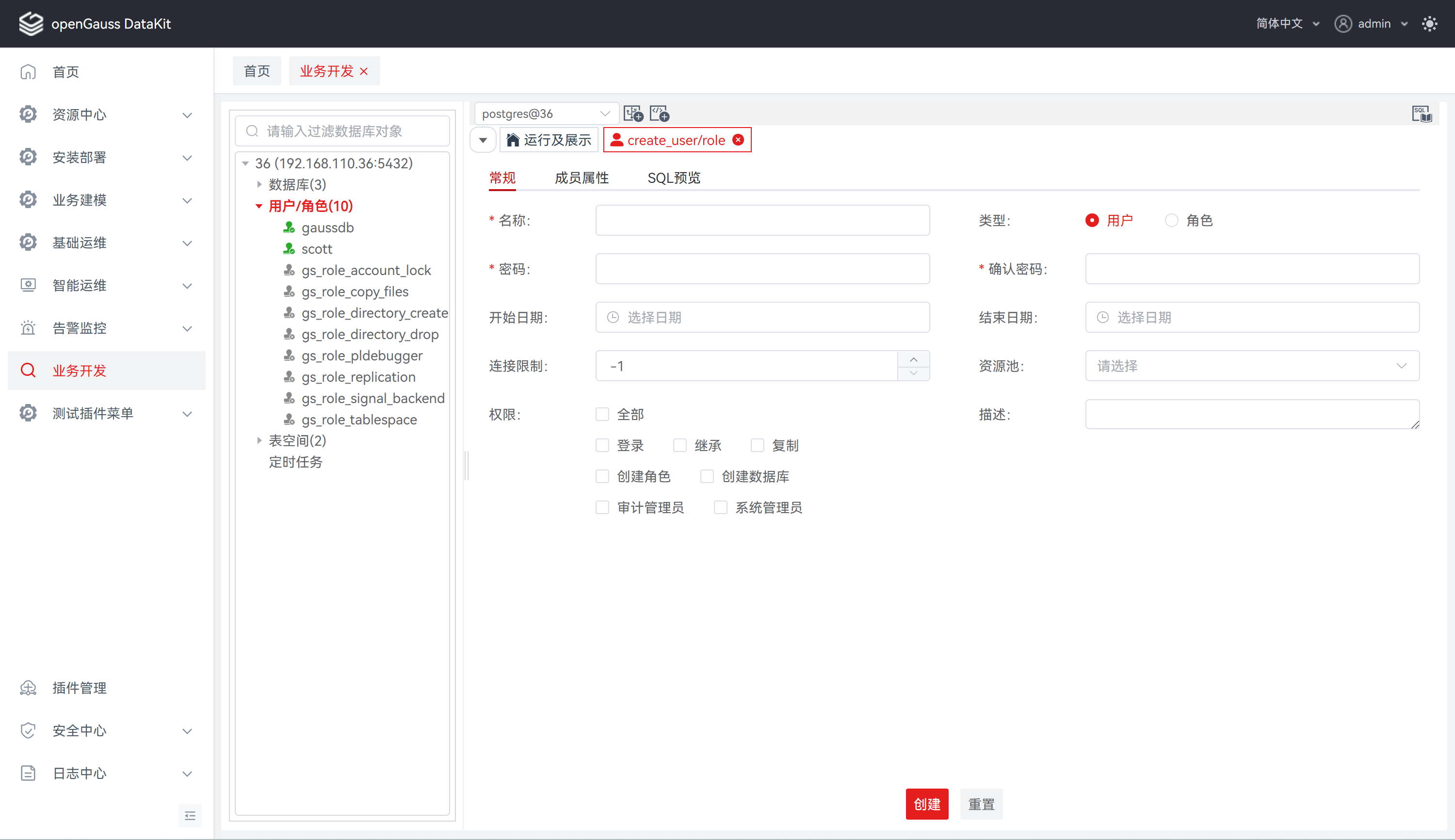 步骤 1: 在 “数据库导航菜单” 窗格中,右键单击连接名称下的 “用户/角色” ,选择 “创建用户/角色” ,跳转至 “创建用户/角色” 页面。