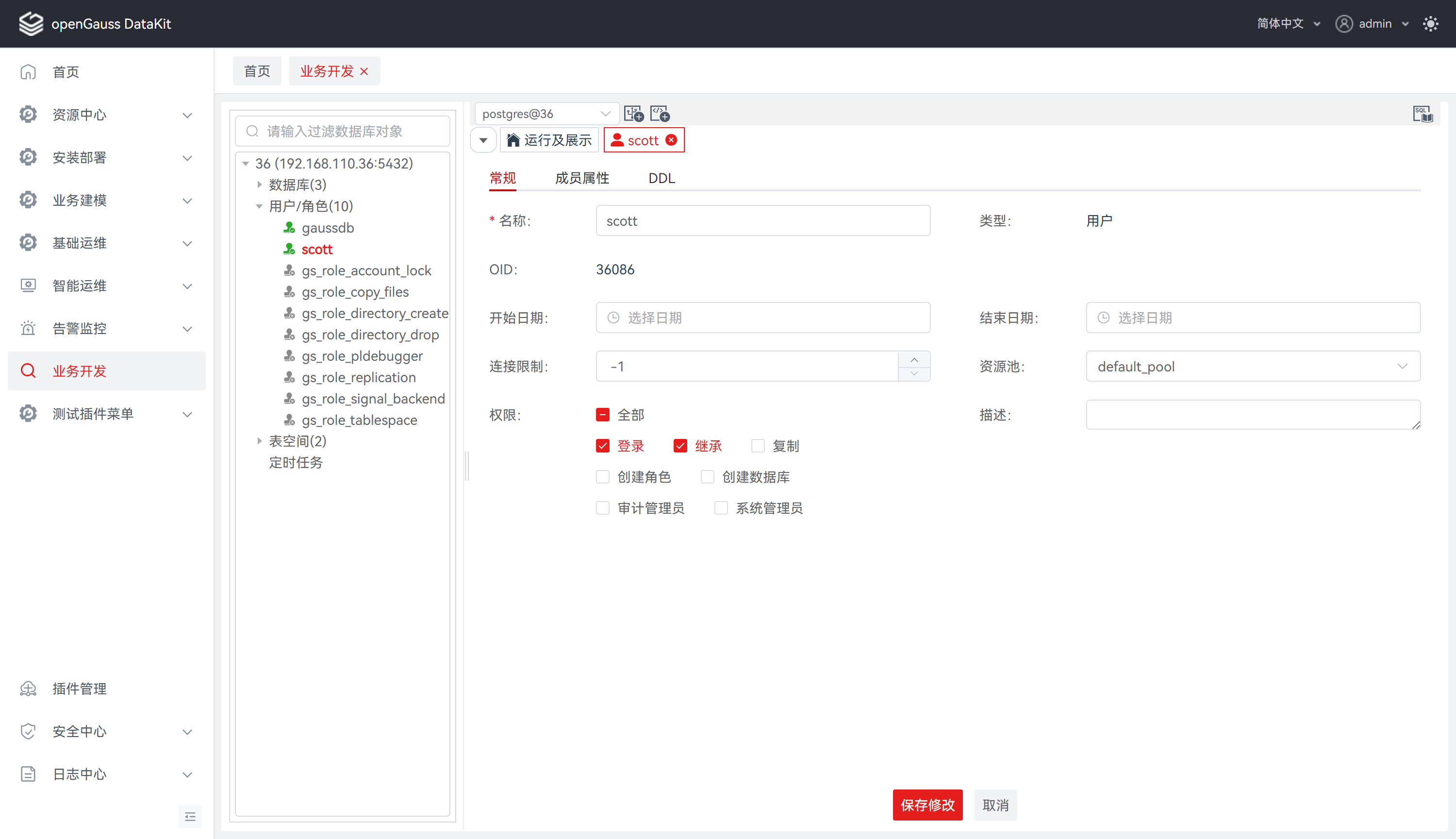 | 资源池 | 是 | 用于为该用户/角色选择资源池,默认数据回显 |