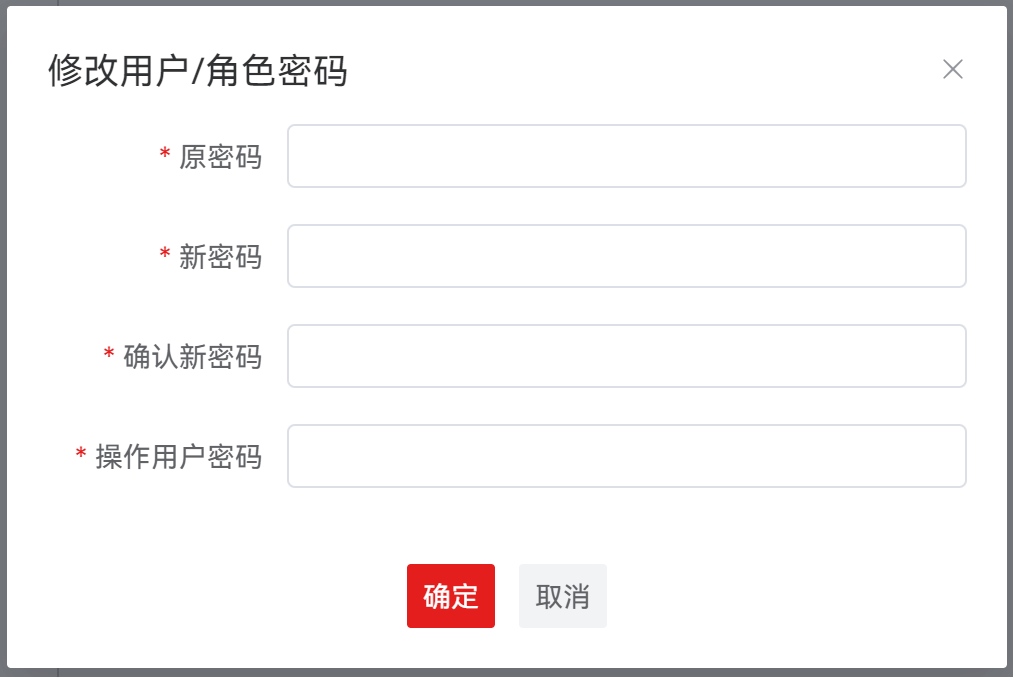 | 确认新密码 | 是 | 用于填写用户/角色新密码 |