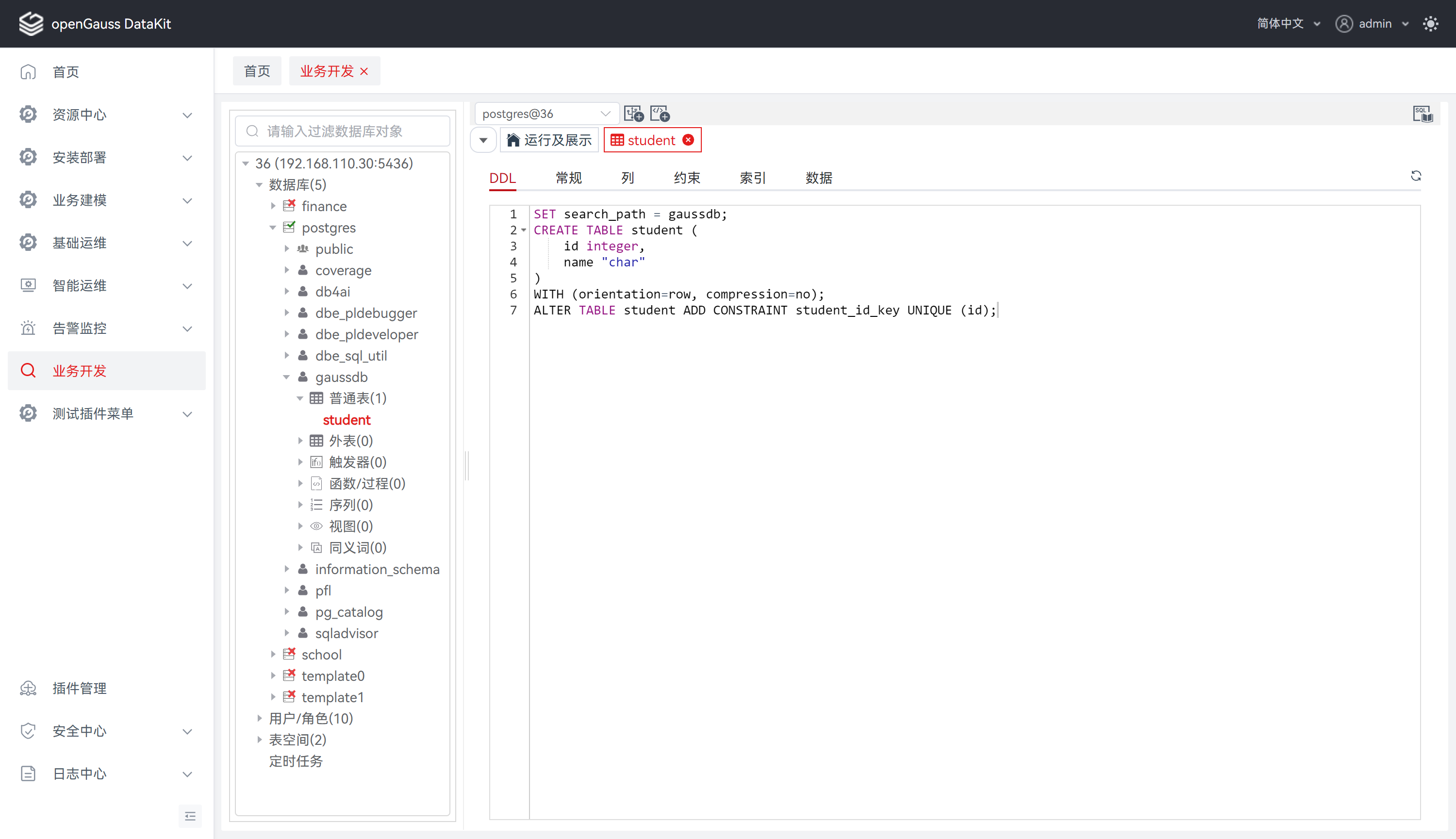 步骤 1: 在 “数据库导航菜单” 窗格中,单击普通表列表,将显示所选表对应的属性与数据,选中 “DDL"。
