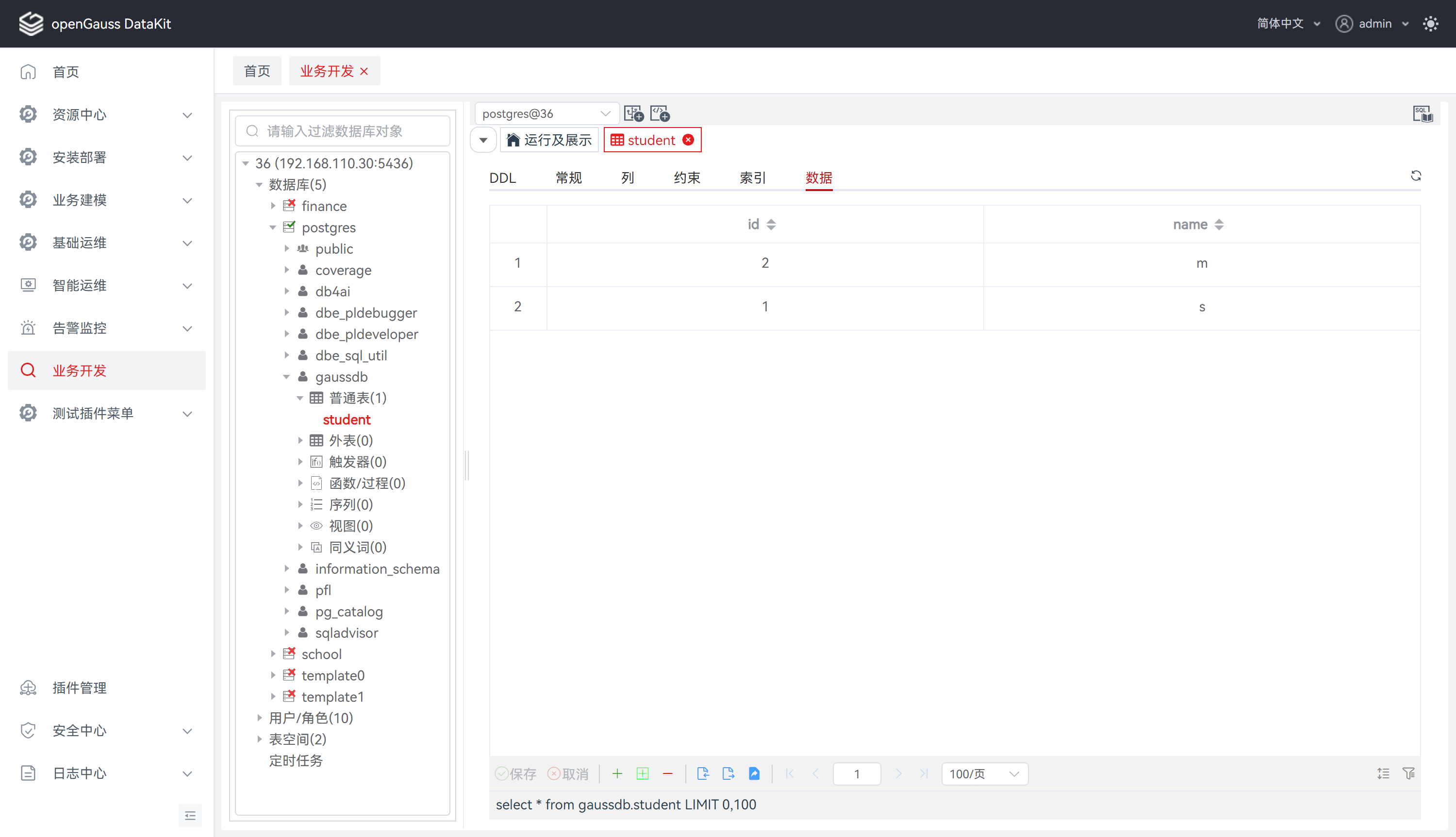 创建表后,可以在该表中添加新的数据。可对当前数据执行新增、修改、删除、筛选、排序、导入、导出操作,同时支持在表数据工具栏下方预览所有操作所对应的 SQL 语句。