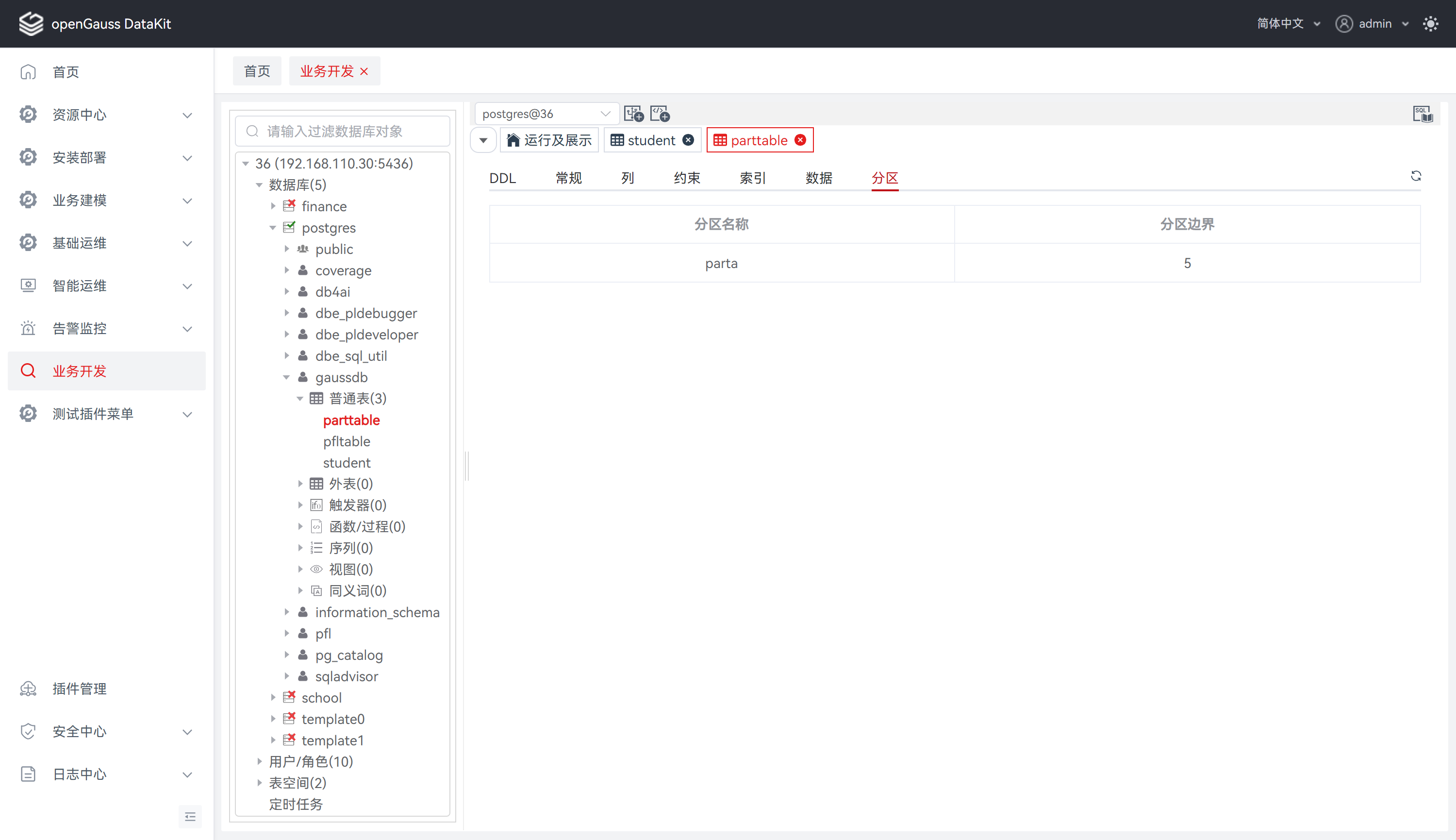 步骤 1: 在 “数据库导航菜单” 窗格中,单击普通表列表,若所选表为分区表,将显示分区属性,选中 “分区"。
