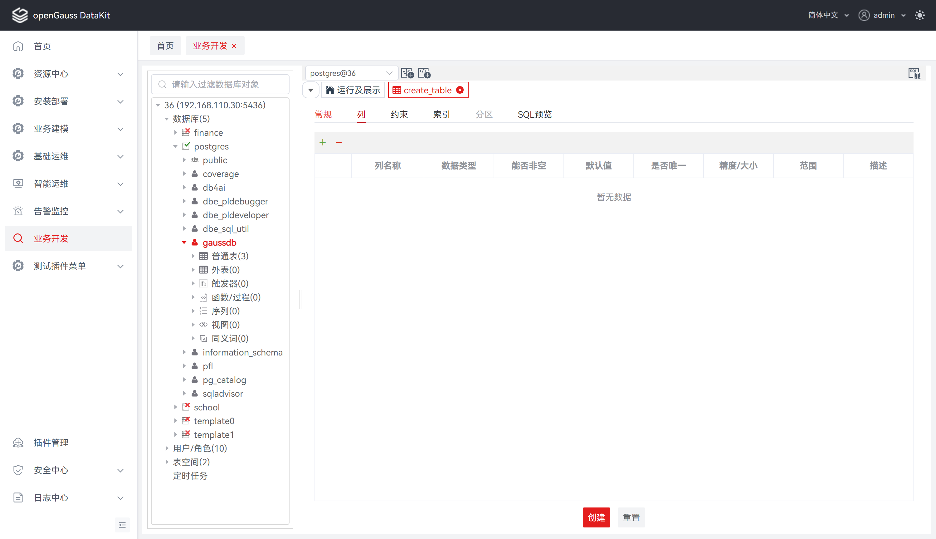 若点击 “创建” ,tab 将自动切换至 “列” ,待补全列信息后才可执行创建操作。