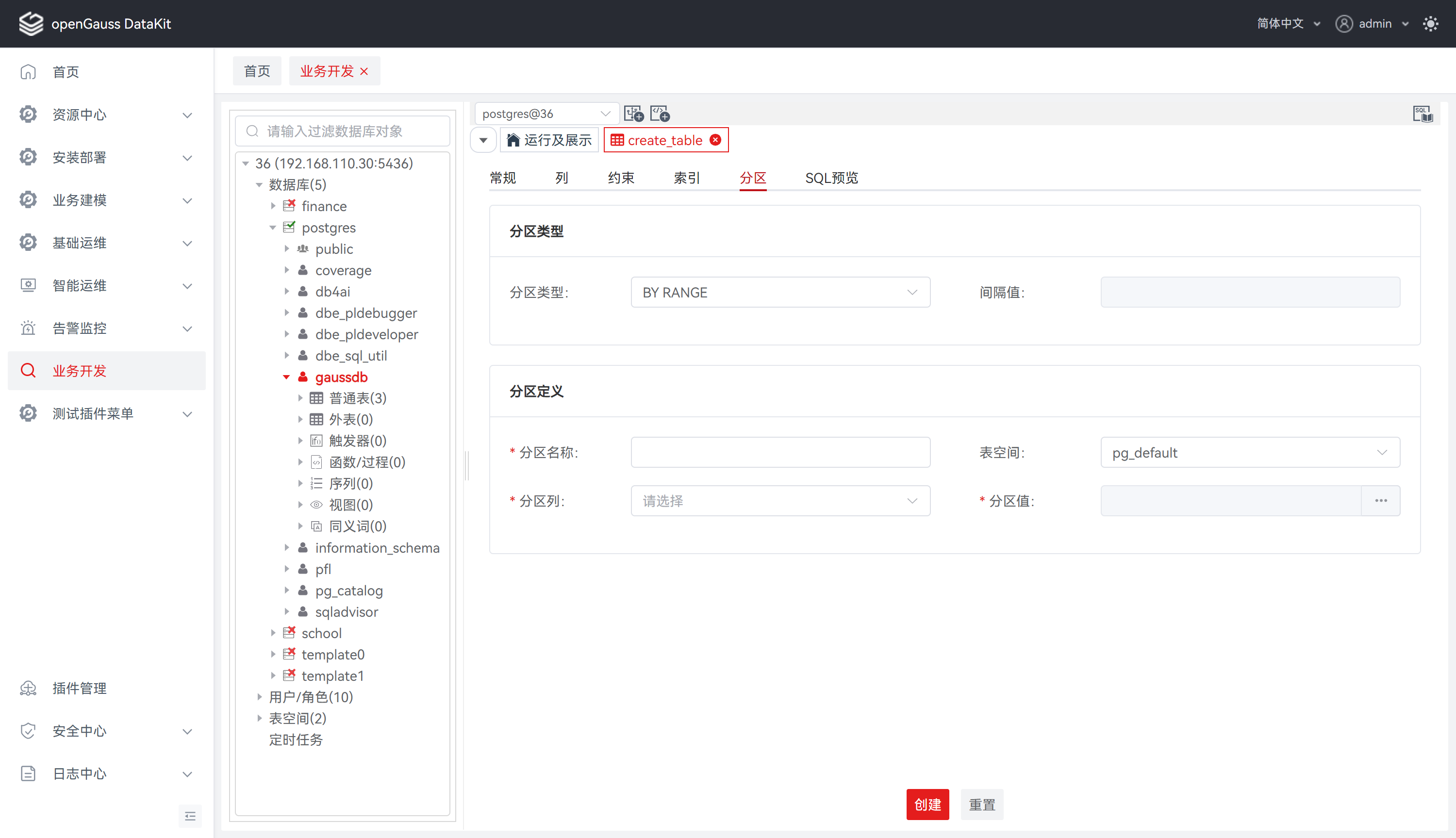 步骤 6: 若在 “常规” 勾选 “是否分区表” 则可点击 “分区” ,定义分区表信息,如表分区类型、间隔值、分区名称、表空间等。详情请参见 定义分区 。