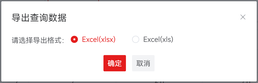 ,弹出导出查询数据对话框,选择导出格式,导出格式为 xlsx、xls,默认选择为 xlsx。