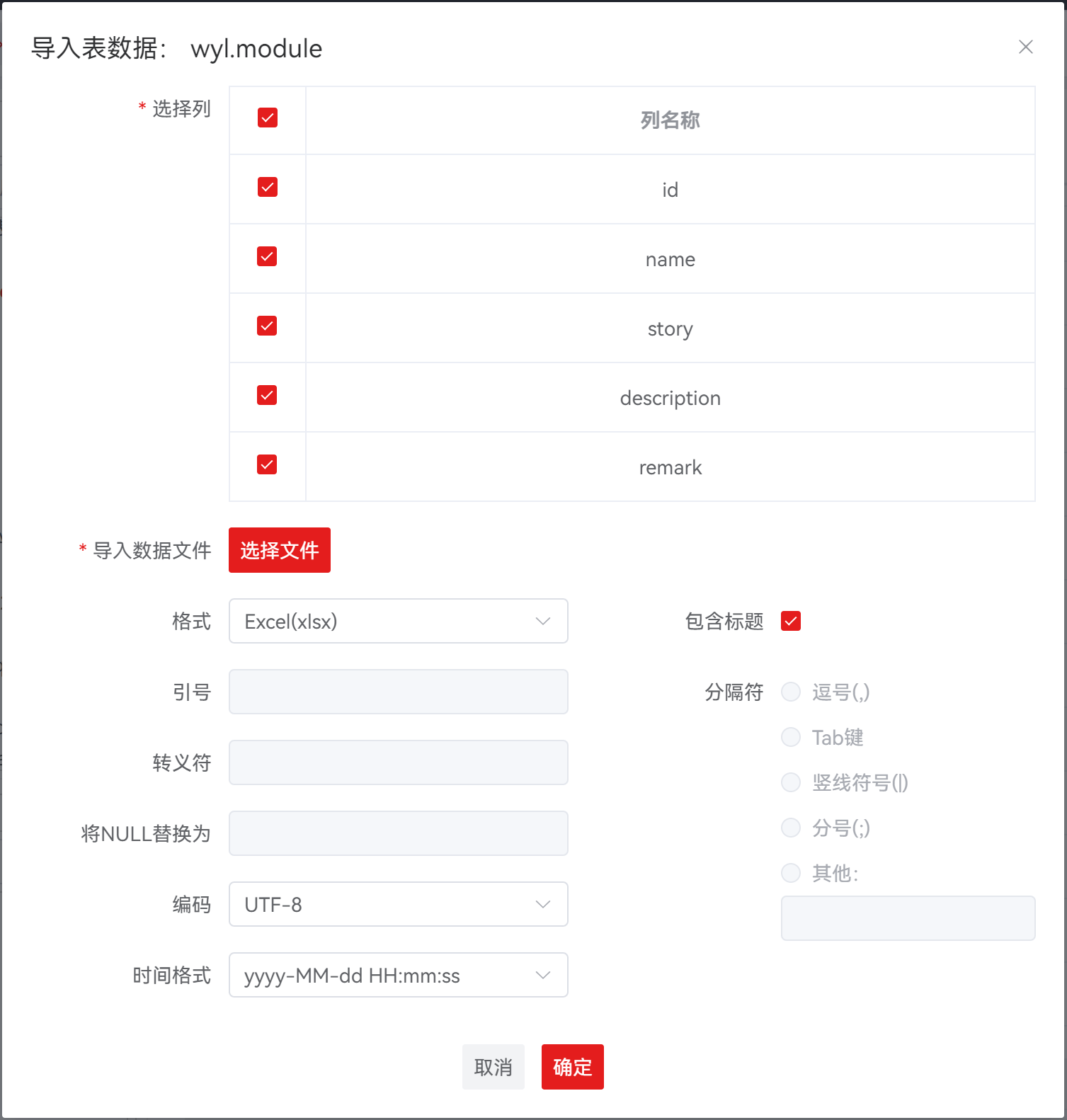 | 包含标题 | 否 | 用于配置导入数据中是否包含列名称,默认包含仅对Binary禁用修改,对Excel(xlsx)、Excel(xls)、CSV、Text(txt)格式启用 |