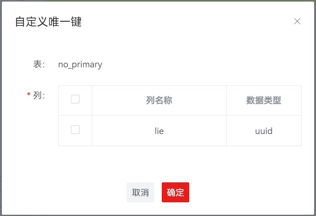说明: 若所操作表未设置主键,将显示 “自定义唯一键” 对话框,详情请参见 自定义唯一键 。