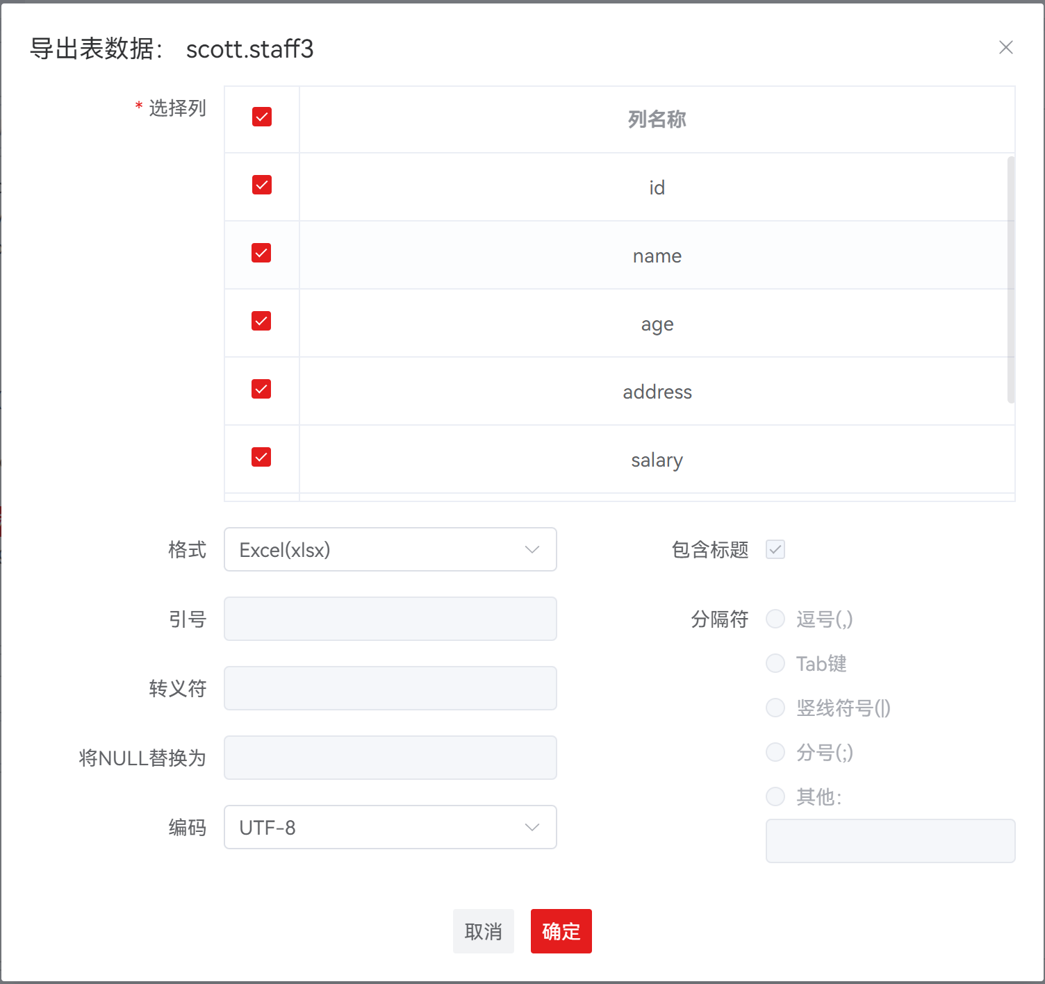 | 选择列 | 是 | 用于选择导出数据对应的列,默认全选 |