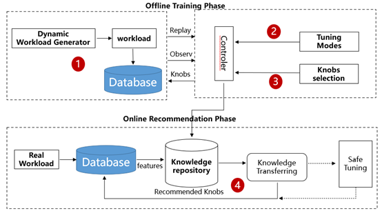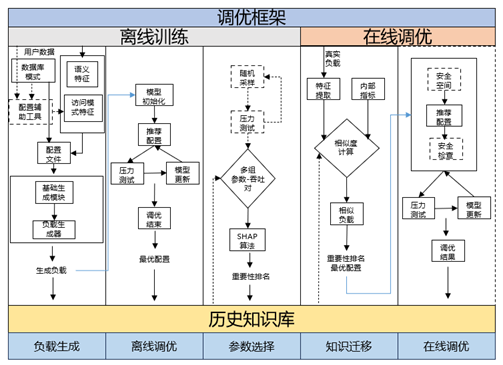通过workload mapping方法,进行数据库负载相似度匹配,将历史经验应用到新数据库调优中。 整体调优流程如下图所示,主要分为离线训练和在线调优两个阶段。离线训练阶段主要用于针对不同优化任务进行调优,其目的在于1)积累丰富的历史经验,构建相对 完善的知识库,以支持在在线调优时能够准确匹配出相似负载,实现快速响应;2)利用调优结果识别重要参数,缩减特征空间,提高调优效率。具体来说,首先由负载 生成器根据不同的负载特征组合生成负载,在真实数据库上执行生成的负载,同时观测数据库性能及相关内部指标。之后将观测值传递给调优模型,调优模型给出一组 推荐的参数并应用在数据库上,再次执行负载并观测结果,用于在下一轮调优中更新调优模型参数。重复上述迭代调优流程,直到调优模型收敛或达到停止条件。 基于迭代过程中产生的数据,执行参数选择模块,通过分析历史数据给出参数重要性排名,用于在线调优时缩减特征空间,提高调优效率。最后将负载-最优配置-重要 性排名合并为一条调优历史数据,保存在历史知识库中。 在线调优阶段即在真实生产场景下,快速响应、动态调优。首先从真实负载和数据库内部指标中提取负载特征, 据此在历史知识库中匹配最为相似的历史负载,通过知识迁移选择对应参数作为推荐配置应用在数据库中。如条件允许,可以在其基础上迭代运行安全调优模型,对参数 做进一步微调,直到模型收敛或达到停止条件。调优后的运行结果同样可以作为历史数据记录到知识库中。