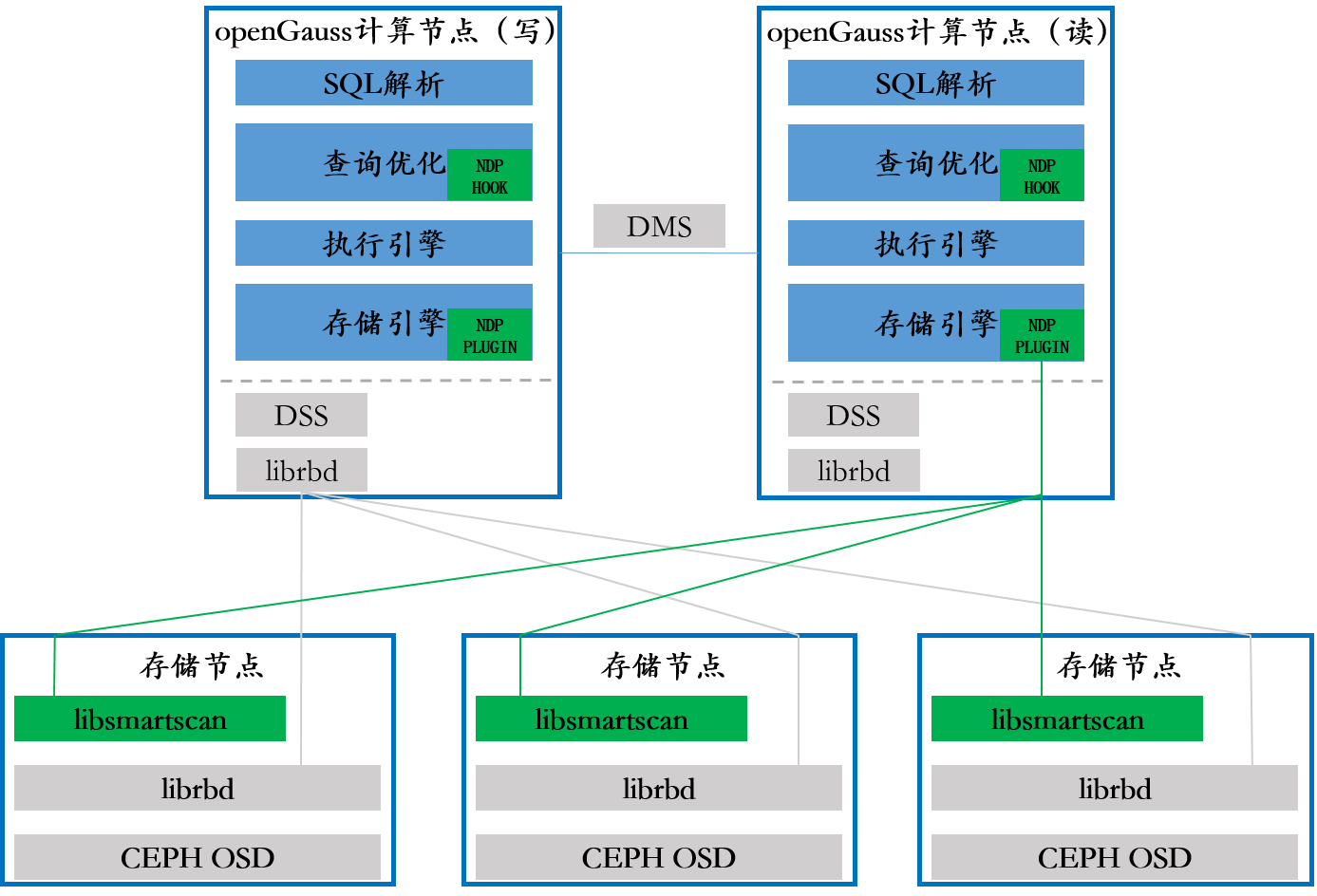 openGauss资源池化算子卸载特性支持Agg、SeqScan、Filter、Projection的逻辑在存储节点上运行,将过滤、投影或聚合后的结果传输到计算节点,计算节点对接收的NDP结果继续处理输出上层算子或者聚合NDP结果,业务对算子卸载无感知。此特性可以减少网络传输的数据IO,同时也可以利用存储节点的算力,提升查询的性能。本特性总体方案分为两部分: