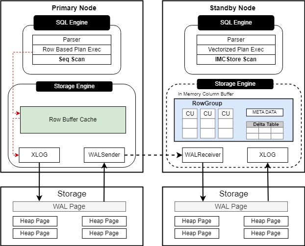 openGauss主备集群场景下,支持备节点形成行列双格式内存形式。针对主节点的行级修改,备节点通过日志同步主节点修改,将对应修改写入增量表中。同时,备节点后台启动的同步线程,将增量表中存储的行存修改同步至列存缓存中。用户在备节点发起的OLAP大型数据分析请求,将先通过逻辑判断是否已有查询表的列缓存数据,并根据代价计算形成基于列缓存的查询计划。