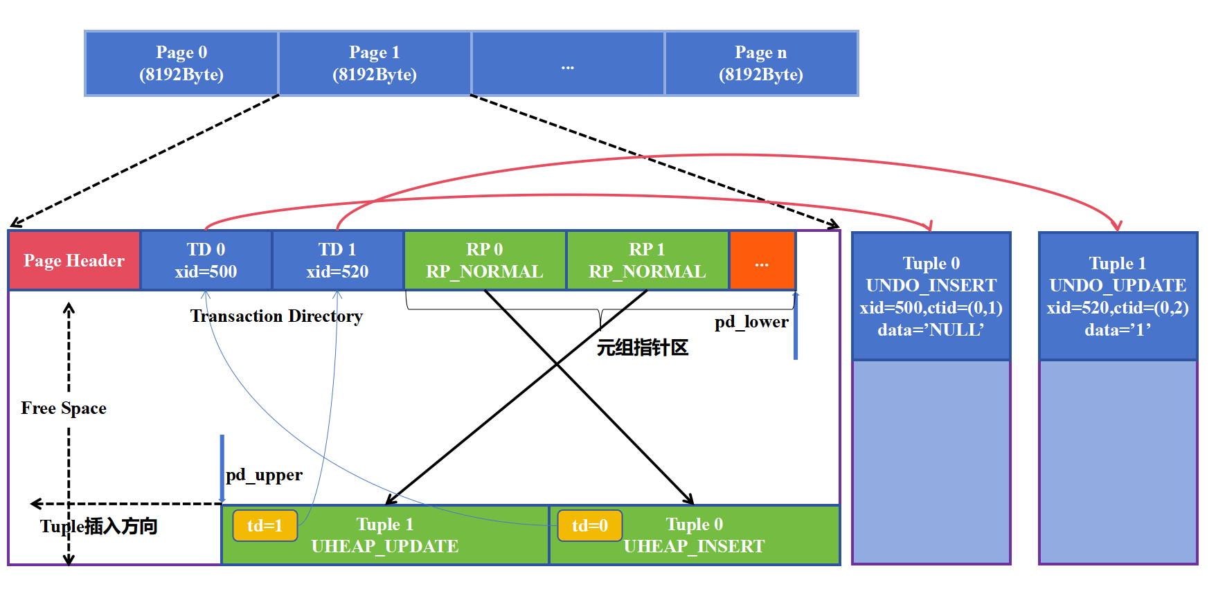 - Ustore 通过维护数据记录的版本链来管理多个版本的数据。每对一条记录进行更新时都会创建一个新版本,并将其连接到现有版本链的末尾。其中旧版本不会立即删除,而是保留在链上,以供正在进行的事务读取。