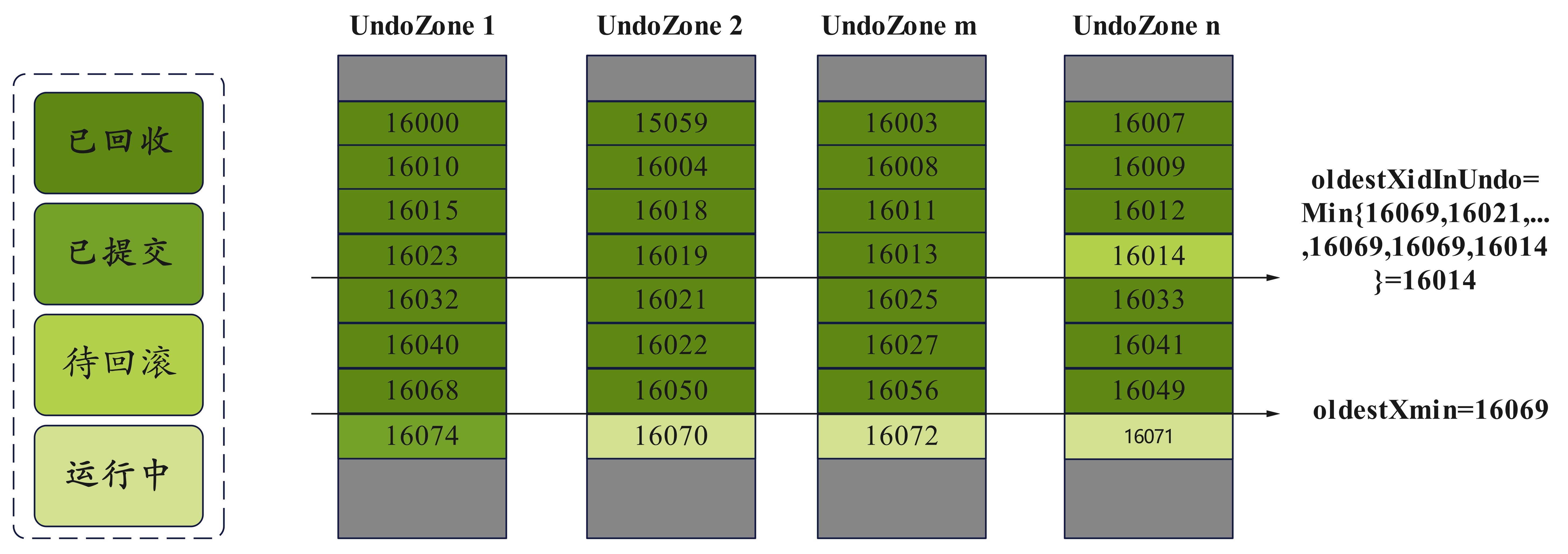 如上图所示,UndoZone1 中回收到小于 oldestXmin 的已提交事务 16068,UndoZone2 中回收到16050,UndoZone m 回收到 16056,UndoZone n 回收到事务 16012,而事务 16014 待回滚但未发生回滚,因此 UndoZone n 回收事务 ID 上限只到16014.其他 zone 的上限是 oldestXmin,oldestXidInUndo 会取所有 Undozone 上的上限最小值,因此 oldestXidInUndo 等于 16014。