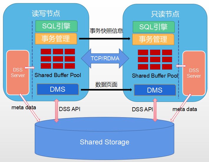 DMS是动态库,集成在数据库内部,通过TCP/RDMA网络传输PAGE内容,将主备内存融合,提供内存池化能力,以此实现备机实时一致性读功能。