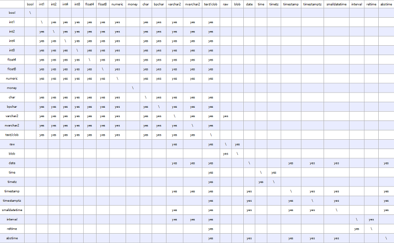 ORA兼容模式,开启 set sql_beta_feature = 'a_style_coerce'; 参数的情况下,所支持的隐式类型转换见下图,\代表不需要转换,yes表示支持,空白表示不支持: